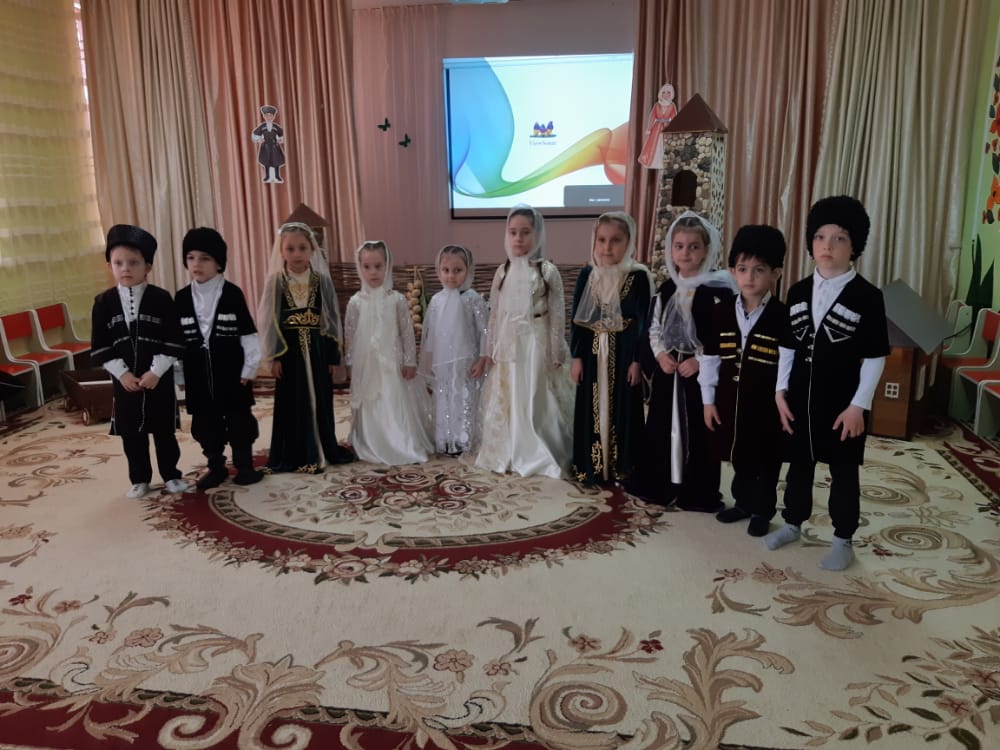 В средних группах «Солнышко» и «Ромашки» были проведены беседы «Родной язык - мое богатство», «Чеченский национальный костюм»; чтение народной сказки «Хийцар», чеченские народные пословицы, поговорки, загадки, слушание гимна Чеченской республики.