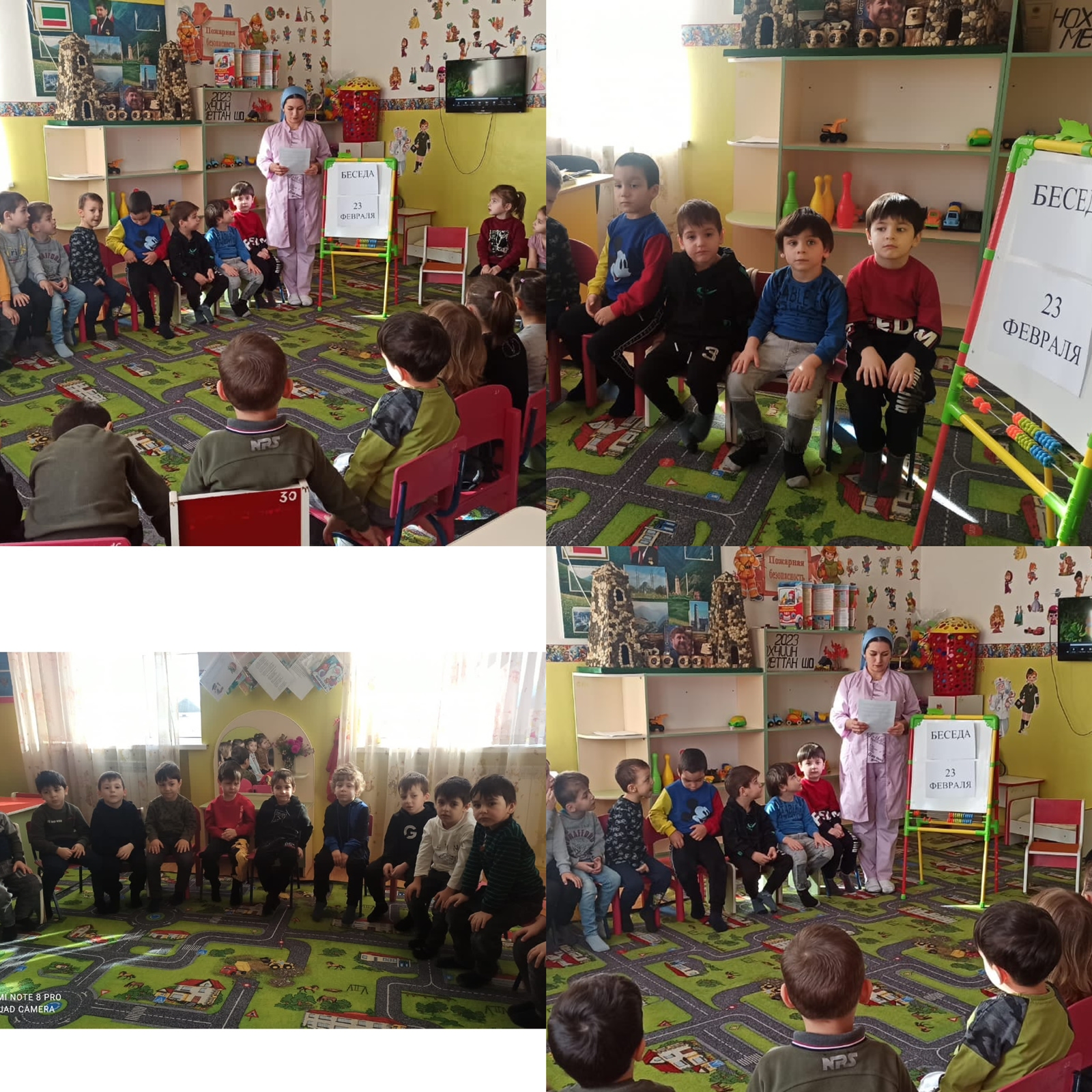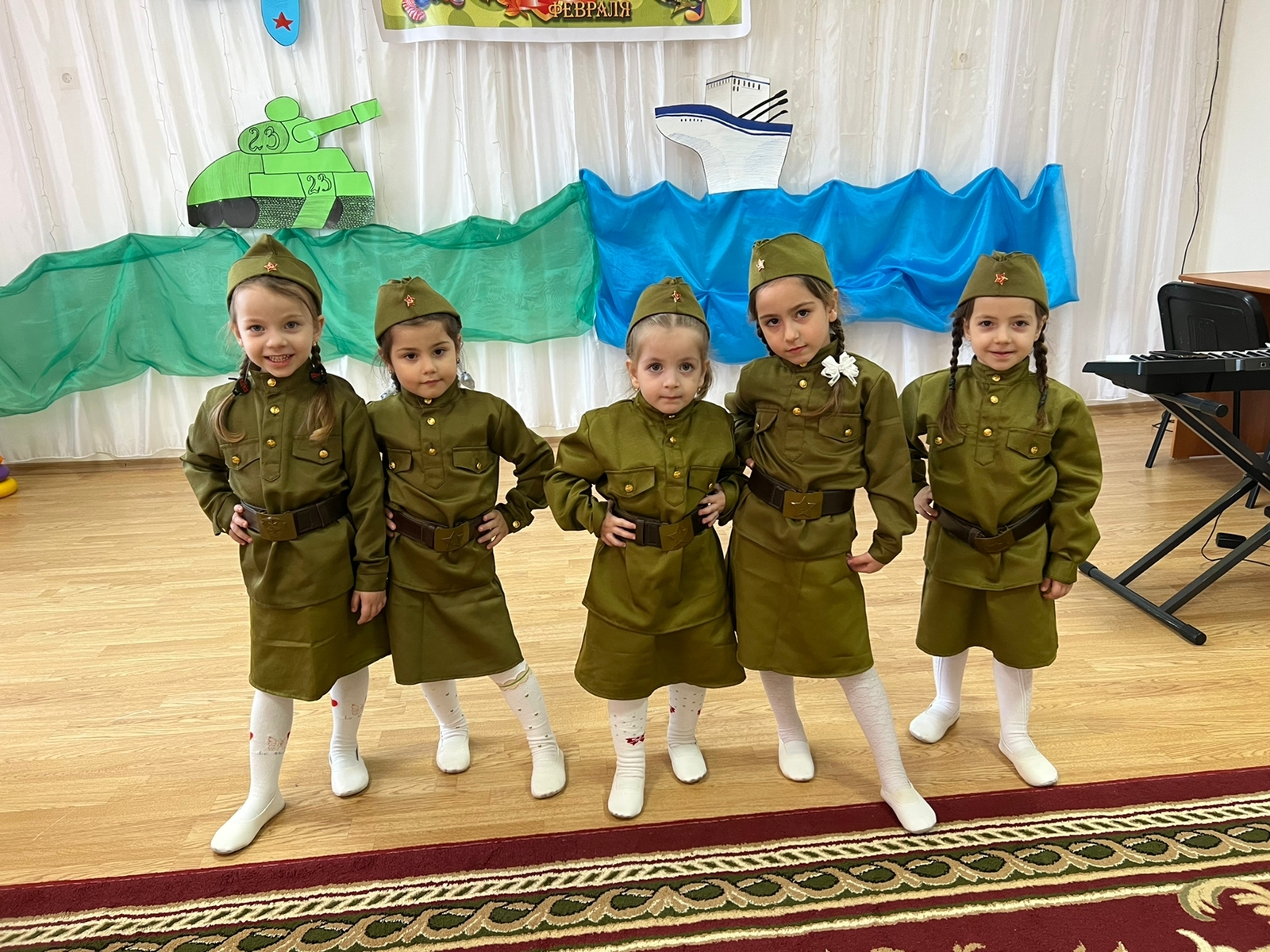 21 февраля в старших группах воспитатели Имурзаева Разет и Алиева Диана провели тематические занятия «Слава защитникам Отечества», в ходе которого воспитатели рассказывали о Российской армии, краткие выдержки из истории русской, Советской, Российской армии. Дети читали стихи и играли в военные игры.