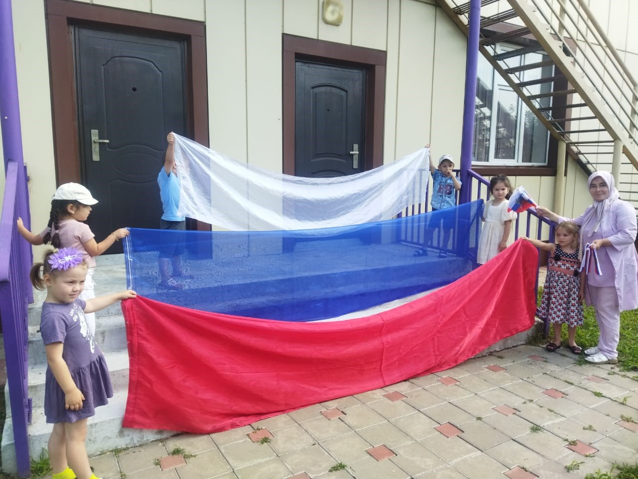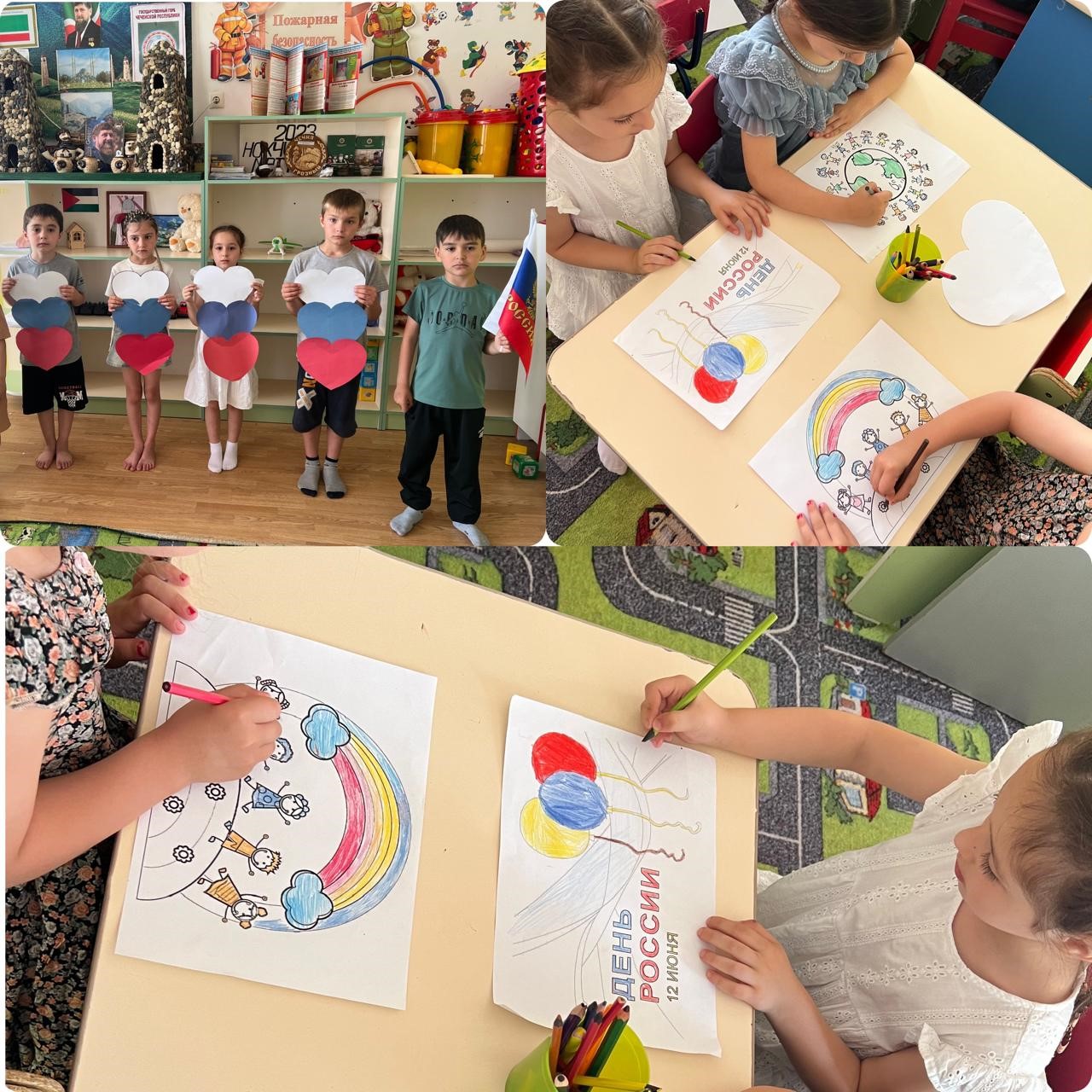 В рамках тематической недели в старшей, средней и младшей группах проводились следующие мероприятия: беседы «Наша Родина - Россия», «Наш флаг и наш герб», прослушивание гимна РФ. Посмотрели презентацию по теме «12 июня - День России». Дети вместе с педагогами раскрашивали флаг России, рассматривали иллюстрации природы нашей страны, достопримечательности Москвы. Изготовили плакат ко дню России.