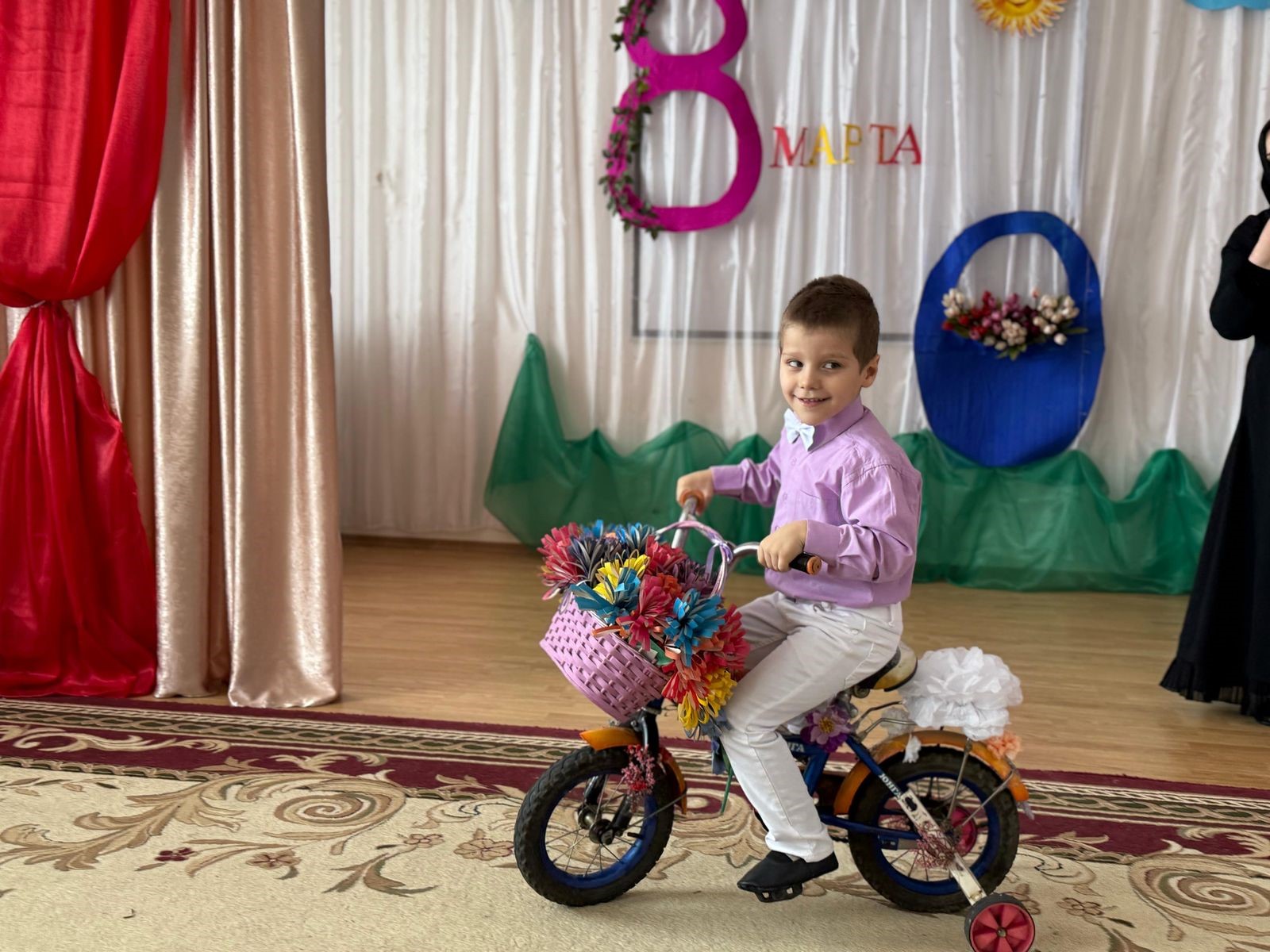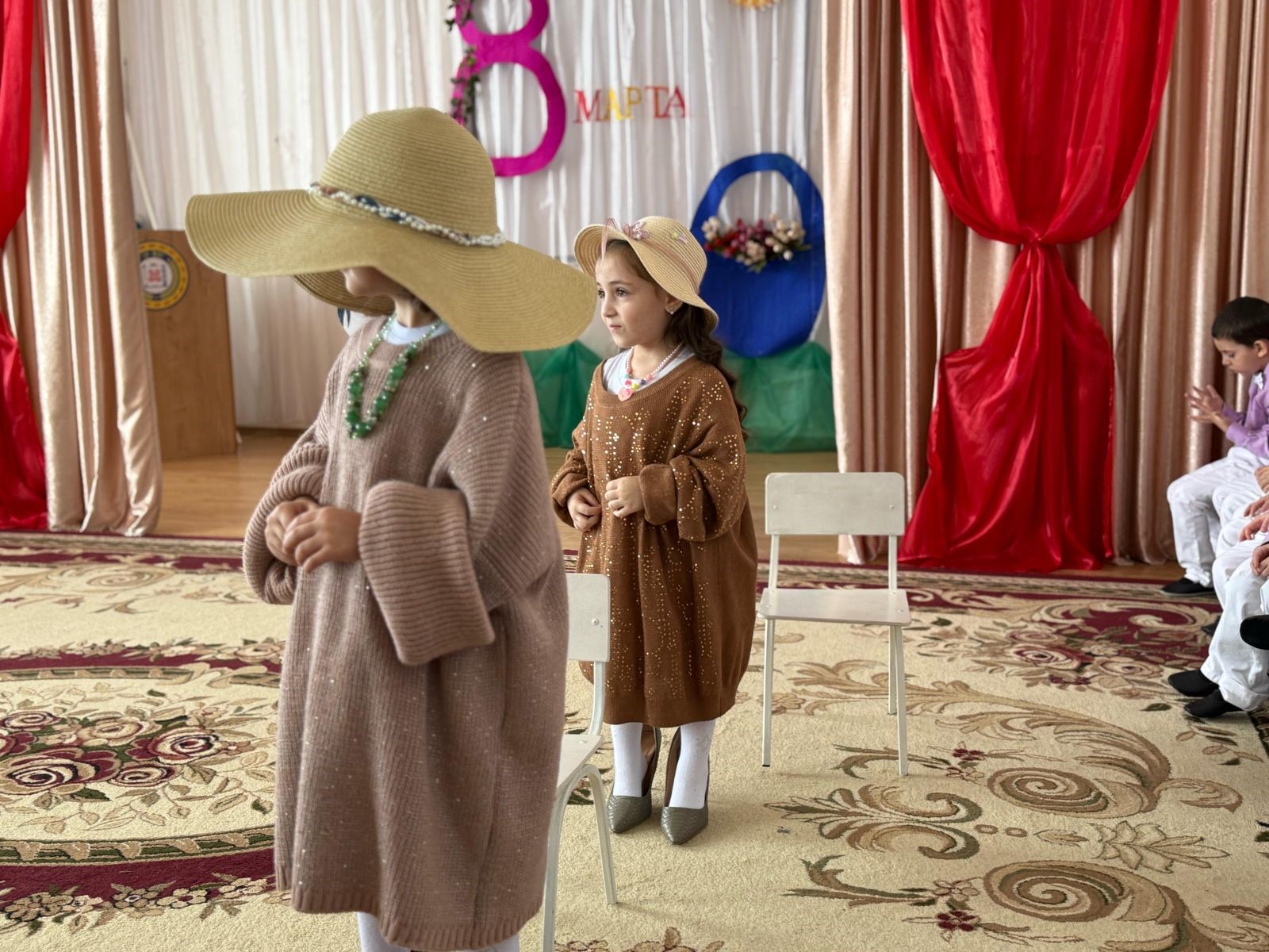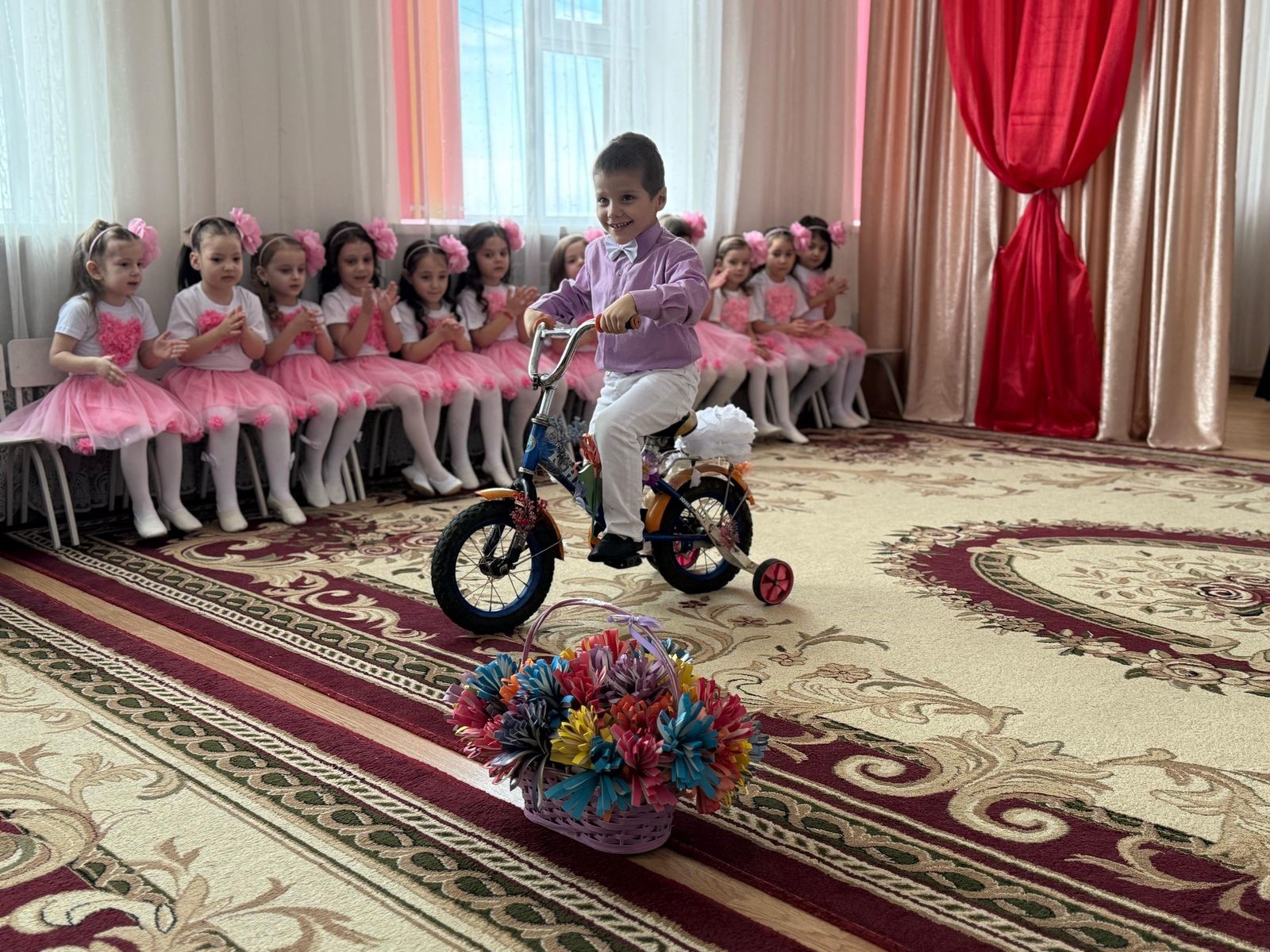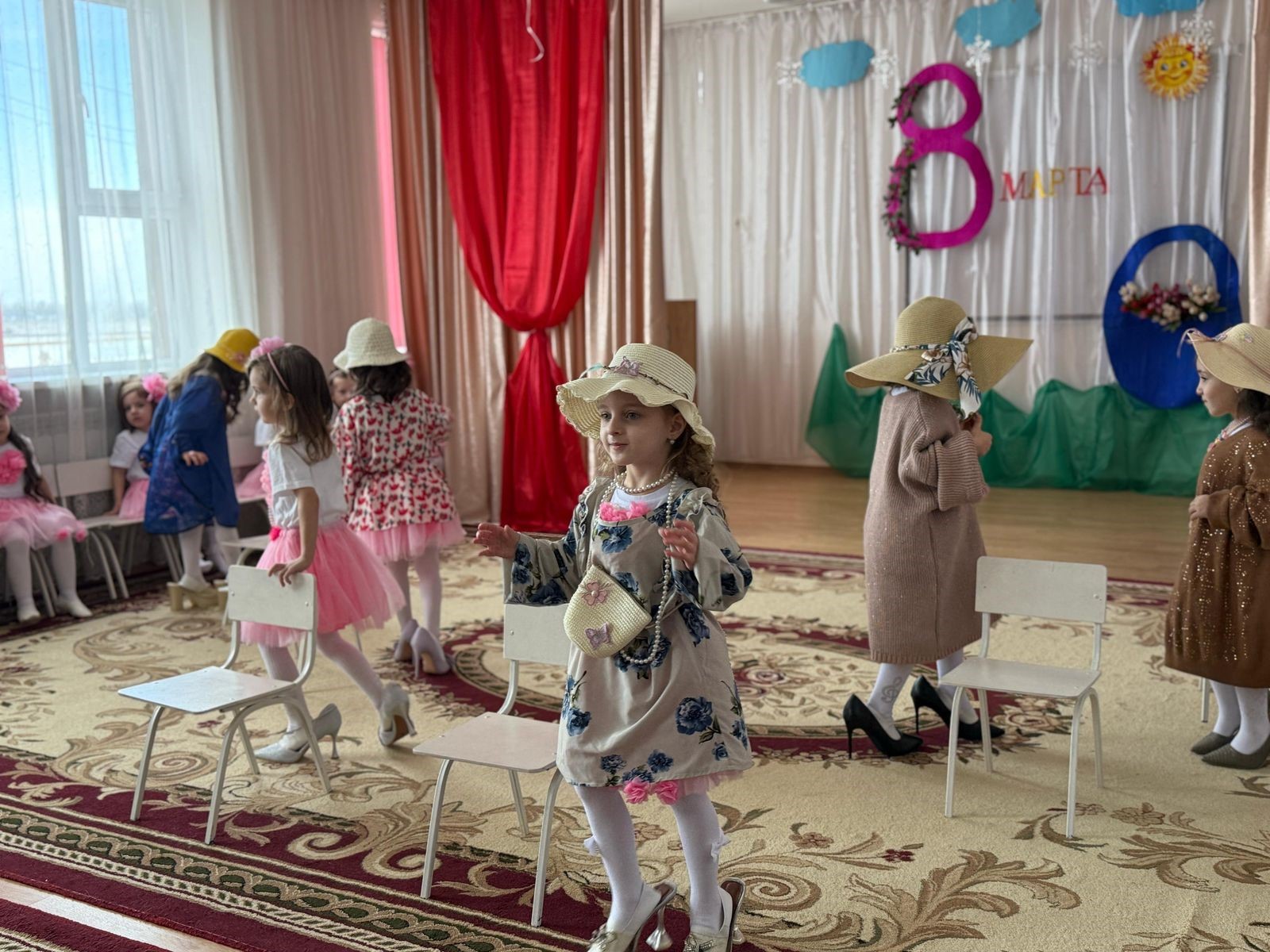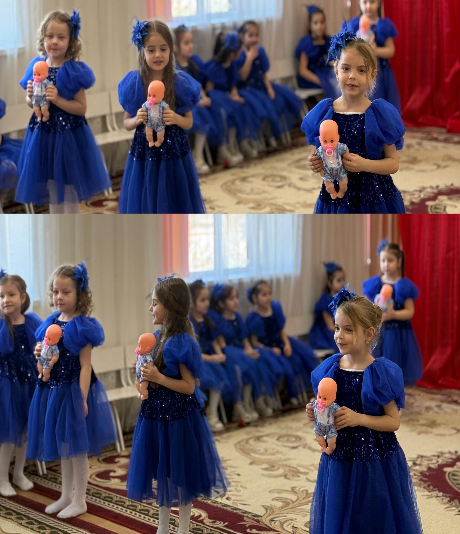 В празднично оформленном зале громко звучала музыка, красиво одетые в костюмы дети с удовольствием кружились по залу, демонстрируя свои наряды.